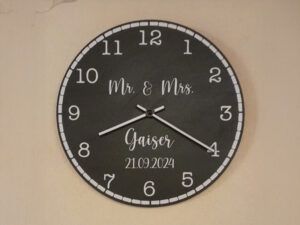 Auf so eine schöne Art wird man den Hochzeitstag nie vergessen – Uhr mit Schriftzug „Mr. & Mrs.“ und Hochzeitsdatum.