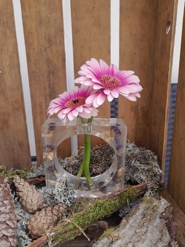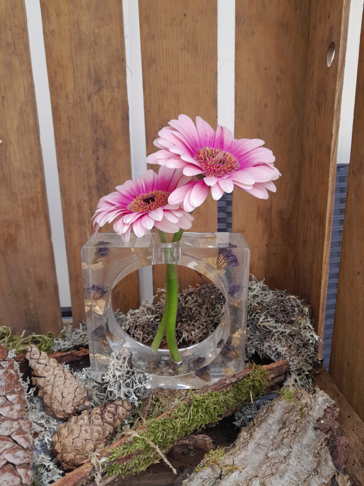 Die Vase kann mit verschiedenen Materialien gestaltet werden, z.B. mit Trockenblumen, Glitzer o.ä.