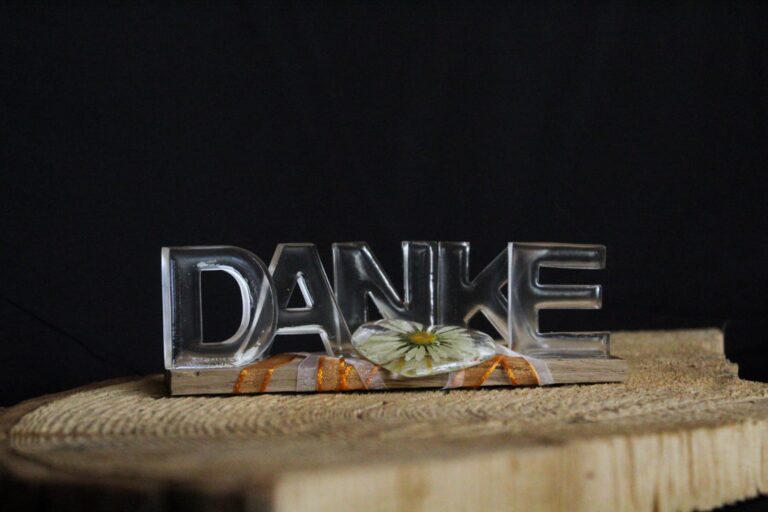 Schriftzug als Aufsteller mit echter Blume im Epoxidharz-Herz